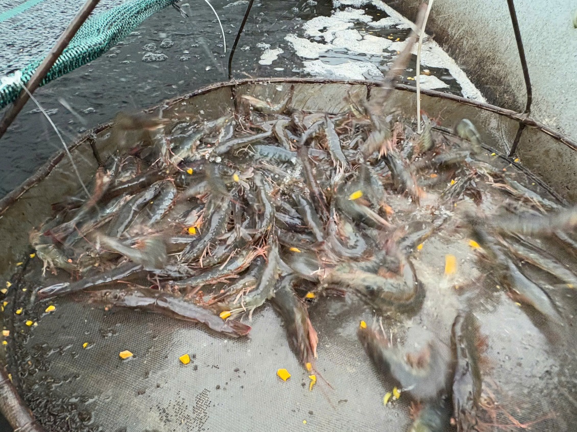 Tôm nuôi với mật độ 300 con/m3, cho ăn bổ sung bí đỏ, năng suất 4,0-4,5kg/m3, chất lượng cao